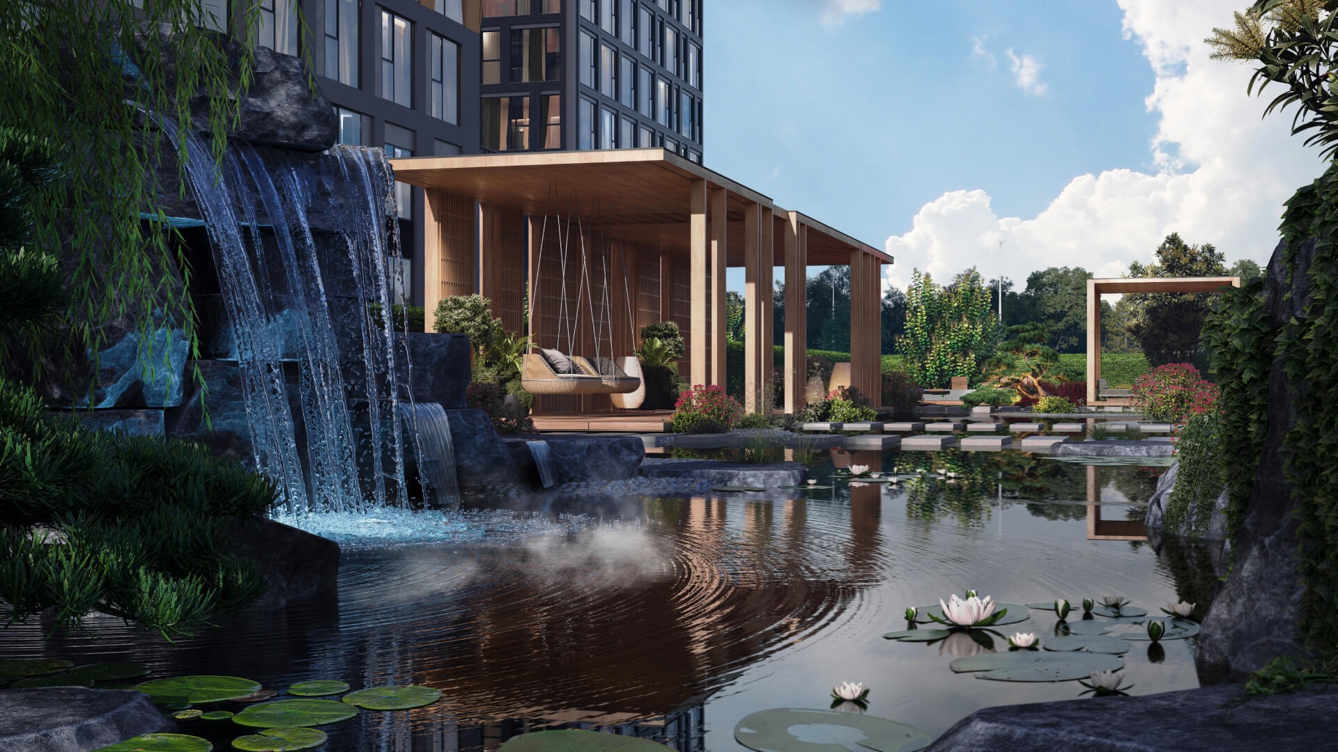 Пространство INDY Towers окружено тщательно продуманным ландшафтным дизайном, вдохновлённым индонезийскими садами и философией дзэн. Во внешнем дворе расположен Водный сад с дорожками, пересекающими пруд, искусственными водопадами, живыми изгородями и зонами медитации. Его центр — деревянный павильон для йоги и wellness-практик, а тишину природы дополняет шелест ветра в кронах и журчание воды. Каждая деталь — от плакучих ив до многолетних растений — подобрана с учётом сезонности, уюта и визуального баланса.